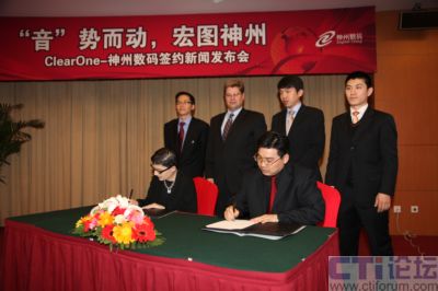 2009年3月10日,國內(nèi)最大的整合IT服務提供商神州數(shù)碼和國際領先的高端音頻會議系統(tǒng)供應商ClearOne在京簽約,共同拓展國內(nèi)音頻會議系統(tǒng)市場,依托ClearOne的技術、產(chǎn)品、行業(yè)優(yōu)勢和神州數(shù)碼強大的市場號召力及運維能力,開創(chuàng)國內(nèi)音頻會議系統(tǒng)領域全新格局,為企業(yè)、教育、培訓、醫(yī)療及政府等行業(yè)客戶帶來全新震撼體驗!