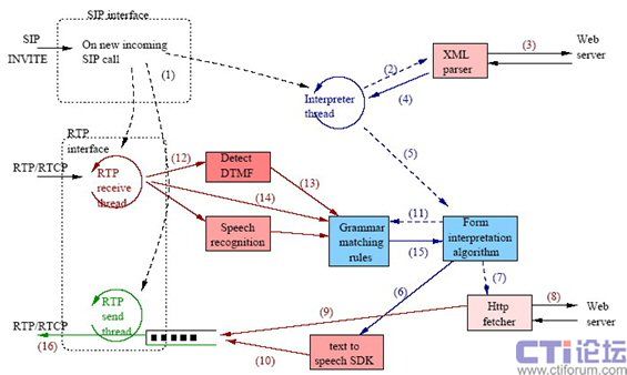 1. 當(dāng)瀏覽器接收到一個(gè)新進(jìn)來的SIP呼叫后,它創(chuàng)建三個(gè)不同線程:RTP接收線程、RTP發(fā)送線程和VoiceXML解釋器線程。RTP接收線程從主叫方接收媒體數(shù)據(jù)包并調(diào)用DTMF檢測模塊;RTP發(fā)送線程將媒體數(shù)據(jù)包以流的方式發(fā)送給主叫方。一個(gè)單獨(dú)的發(fā)送線程幫助維護(hù)外出數(shù)據(jù)報(bào)的固定帶寬(比如針對G.711音頻的64