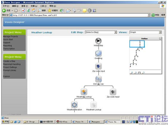 Home,在打開的Voxeo Prophecy網(wǎng)頁中點(diǎn)擊Prophecy Designer即開始了我們創(chuàng)建VoiceXML項(xiàng)目的輕松之旅。該設(shè)計(jì)工具將整個(gè)VoiceXML應(yīng)用以圖表或樹狀結(jié)構(gòu)直觀地呈現(xiàn)給開發(fā)者,可以方便地控制和修改其交互流程,如圖3所示。