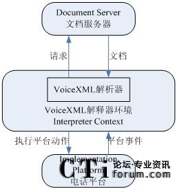 VoiceXML解析器上下文和VoiceXML解釋器負責解析VoiceXML文件,控制執(zhí)行平臺。執(zhí)行平臺提供合成語音的輸出(text to