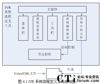 從圖4.4所示結(jié)構(gòu)中,通過主窗體可以訪問其它窗體操作,同時控制窗體與類模塊的信息交互。系統(tǒng)中的各個窗口的實現(xiàn)均是基于基礎(chǔ)類包的。下面詳細介紹IVR系統(tǒng)流程工具各個部分的實現(xiàn)。其實現(xiàn)工具的內(nèi)容詳見文獻[31]。