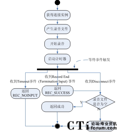 5)如果接收到SC_EVENT_DISCCONET事件,表示用戶主動放棄,轉(zhuǎn)到步驟7;如果接收到SC_EVENT_TIMEOUT事件,表示用戶在計時器的時間內(nèi)沒有輸入,返回REC_NOINPUT,調(diào)用EndSession,流程結(jié)束;如果接收到SC_EVENT_RECORD_RECEIVED事件,表示用戶錄音完畢,進入下一步;