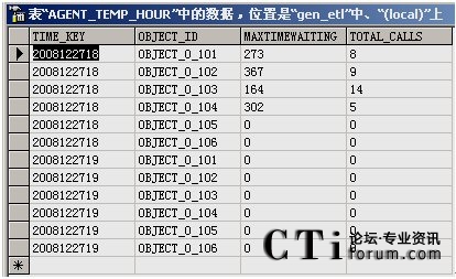 從報表數(shù)據(jù)庫的相應表中,可以看出報表需要統(tǒng)計的數(shù)據(jù)信息都以表單形式列出來。圖中的Time Key表示收集數(shù)據(jù)的具體時刻,object_id表示目標對象在配置數(shù)據(jù)庫中存儲的ID號。MaxTimeWaiting和Total_Calls屬性對應的是根據(jù)模板項要求統(tǒng)計的數(shù)據(jù),分別為最大等待時間和內(nèi)線呼叫總量。下面利用報表展現(xiàn)工具可以直接將該數(shù)據(jù)展示出來,生成需要的報表。