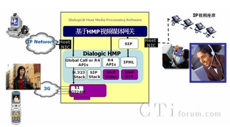 基于Dialogic HMP(Host Media processing)主機媒體處理技術(shù)的視頻呼叫中心主要通過網(wǎng)絡(luò)接口卡(“瘦卡”,Digital Network Interface卡)與PSTN(3G)相連。這里的PSTN包括電信、聯(lián)通和移動等電信運營商。也可以通過H.323、SIP協(xié)議棧直接接受來自數(shù)據(jù)網(wǎng)絡(luò)的多媒體呼叫。