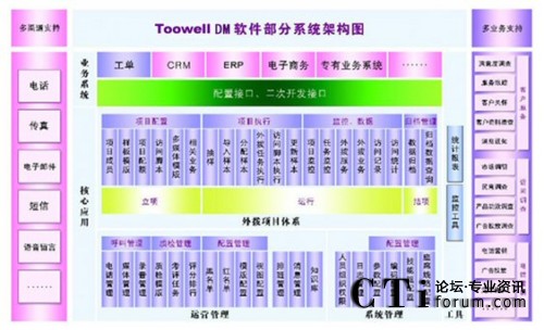 - Toowell DM 具備強(qiáng)大的業(yè)務(wù)整合能力,軟件框架基于呼叫中心全方位解決方案,支持訂單、投訴、業(yè)務(wù)開(kāi)通、知識(shí)管理等。