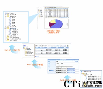 客戶關(guān)系管理,以KPI分析器(KAU)、查詢分析器(SAU)、類型分析器(TAU)為核心,實現(xiàn)客戶信息管理、查詢、分類、挖掘的目標(biāo)需求: