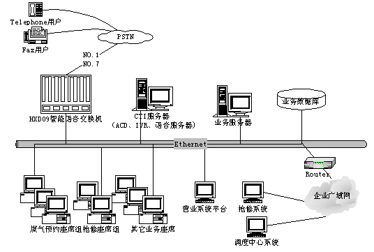 如何為客戶提供"一個(gè)電話對(duì)外"和"一站式"的服務(wù)便成了最急待解決的課題。隨著近年來(lái)CTI技術(shù)的蓬勃發(fā)展,特別是新一代智能語(yǔ)音交換機(jī)的推出,使這一問(wèn)題迎刃而解。我們能夠方便地建設(shè)一套技術(shù)先進(jìn)、穩(wěn)定高效、價(jià)格合理、適合于燃?xì)庑袠I(yè)的呼叫中心。