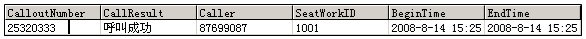 當座席E1呼入時, 接收主叫號碼(87699078), 同時發(fā)出呼叫(主叫號碼為87699078,被叫為25320333),并通過預測撥號識別各類呼叫結(jié)果,如:忙音、空號、或無人接聽等,只將有效的通話轉(zhuǎn)接至業(yè)務(wù)人員,同時將呼叫結(jié)果寫入數(shù)據(jù)庫UT_IMCALL表(如下圖),