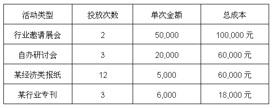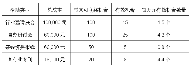 從前面的分析中,我們曾經(jīng)談到過:市場的核心是用最低的成本,幫助企業(yè)把目標(biāo)客戶推動成為機會客戶。那么,同樣成本推動為有效機會客戶數(shù)量的多少,則是評價市場方案的有效模型。當(dāng)然,針對個人消費市場,似乎可以用更加簡單的投入產(chǎn)出比進行分析,一種類型的市場投放運作,在一定時間內(nèi)帶來的業(yè)績收益與成本的比較,可以方便地了解到不同類型市場投放的效益對比;而對于大部分需要有銷售過程的機構(gòu)消費客戶,我們可以參考以下我們對劉總公司拿出的模型示例: