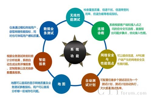 該系統(tǒng)能夠向用戶提供豐富的802.11 a/b/g/n無線參數(shù),包括信號強度覆蓋參數(shù),同頻干擾及鄰頻干擾參數(shù),管理幀、控制幀、數(shù)據(jù)幀及各種無線幀傳輸速率的統(tǒng)計參數(shù)等;系統(tǒng)能基于以上各類統(tǒng)計參數(shù),并通過實時進行各種數(shù)據(jù)業(yè)務(wù)測試,獲取網(wǎng)絡(luò)的數(shù)據(jù)業(yè)務(wù)參數(shù)指標(biāo),分析WLAN網(wǎng)絡(luò)質(zhì)量問題。