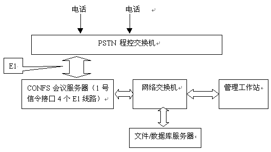 系統(tǒng)主要由網(wǎng)絡(luò)、數(shù)據(jù)庫服務(wù)器(DBS)、會(huì)議服務(wù)器(CONFS)、管理工作站幾個(gè)部分組成。數(shù)據(jù)庫服務(wù)器主要負(fù)責(zé)數(shù)據(jù)的存儲(chǔ),而CONFS完成電話話路的接入與會(huì)議控制,彼此之間相輔相承。如圖所示: