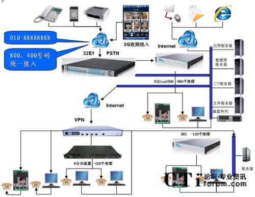 系統(tǒng)接入運(yùn)營(yíng)商的數(shù)字中繼、Internet寬帶網(wǎng)絡(luò),單機(jī)最大可提供本地960個(gè)模擬坐席。通過VPN(單獨(dú)組建VPN或者利用防火墻VPN也可)可將IP坐席分布到能夠聯(lián)通網(wǎng)絡(luò)的局域網(wǎng)任意一端口電腦或者部署到傳統(tǒng)Internet廣域互聯(lián)網(wǎng)的另一城市的分支機(jī)構(gòu)。