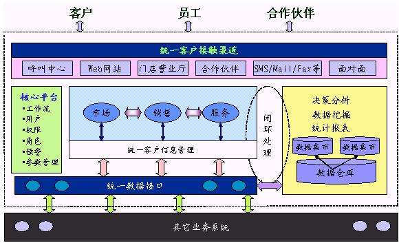 HOLLYCRM(合力金橋軟件公司)推出的HollyCRM是全面集成的客戶關(guān)系管理解決方案,覆蓋協(xié)作型CRM、運(yùn)營型CRM和分析型CRM的全部范疇。HollyCRM通過telephone、Email、Fax、WAP、Web、PDA、Face to Face等各種各樣渠道與客戶互動,通過市場營銷(Marketing)、銷售(Sales)和服務(wù)(Service)等業(yè)務(wù)流程的管理,將客戶的各種背景信息、偏好、行為習(xí)慣、交易數(shù)據(jù)、信用狀況等信息收集并整合在一起,再將這些運(yùn)營數(shù)據(jù)和外來的市場數(shù)據(jù)經(jīng)過整合和變換,裝載進(jìn)數(shù)據(jù)倉庫(Data Warehouse)后,運(yùn)用OLAP和數(shù)據(jù)挖掘(Data Mining)等技術(shù)來從數(shù)據(jù)中分析和提取相關(guān)規(guī)律、模型和趨勢,把有關(guān)客戶信息和知識在整個(gè)企業(yè)內(nèi)得到有效的流轉(zhuǎn)和共享,并進(jìn)一步轉(zhuǎn)化為企業(yè)的戰(zhàn)略規(guī)劃和科學(xué)決策,用于提高在所有渠道上同客戶交互的有效性和針對性,把合適的產(chǎn)品和服務(wù),通過合適的渠道,在適當(dāng)?shù)臅r(shí)候,提供給適當(dāng)?shù)目蛻,從而?shí)現(xiàn)利潤的最大化。
