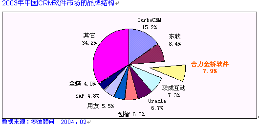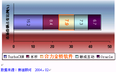 2004年2月10日,北京。賽迪顧問(CCID Consulting )在中國大飯店隆重舉辦了"2004IT市場年會", 會上發(fā)布了《2003-2004年中國管理軟件產(chǎn)業(yè)投資機會研究年度報告》。HOLLYCRM(合力金橋軟件)公司在強手如林的評選中憑借其強勁的市場占有份額、深厚的品牌實力及出眾的用戶美譽度無可爭議地穩(wěn)居2003年度中國CRM軟件整體市場份額前三甲, 同時更奪得了2003年度中國電信行業(yè)CRM市場份額龍頭位置。