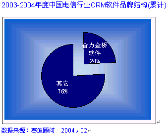 HOLLYCRM(合力金橋軟件)公司作為實力卓越的CRM主流廠商, 致力于提供最專業(yè)化的應用軟件和服務,提供以客戶為核心的信息化解決方案,服務領(lǐng)域跨越電信運營商、金融業(yè)、制造業(yè)等行業(yè)。在電信行業(yè)的CRM市場中,合力金橋軟件處于穩(wěn)固領(lǐng)先位置, 其推出的客戶關(guān)系管理解決方案,覆蓋協(xié)作型、運營型和分析型的全部范疇。在CRM產(chǎn)業(yè)在2003年的中國發(fā)展態(tài)勢整體放緩的大環(huán)境下, HOLLYCRM卻一枝獨秀, 在不到一年的時間里簽下中國網(wǎng)通總部、天津網(wǎng)通、山西網(wǎng)通、內(nèi)蒙聯(lián)通等大型CRM項目,積累了豐富的CRM項目實施經(jīng)驗。在累計的電信行業(yè)CRM軟件市場中,合力金橋軟件一家占有份額就達到24%, 合力金橋軟件此次在CCID年度研究報告中倍受矚目可謂眾望所歸, 充分說明了其CRM產(chǎn)品在高端行業(yè)的領(lǐng)軍地位, 如圖: