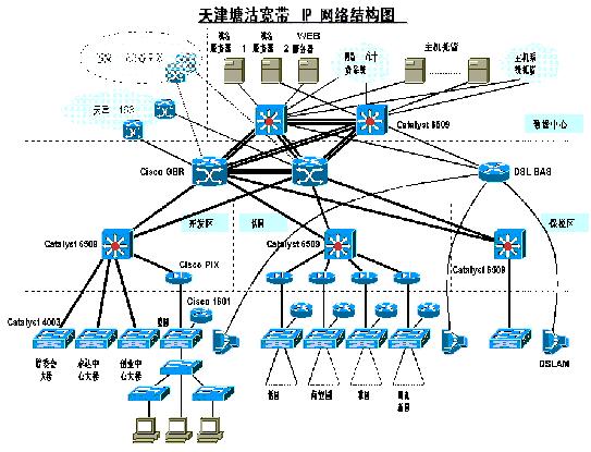 塘沽寬帶網(wǎng)的網(wǎng)絡拓撲結構如下圖所示: