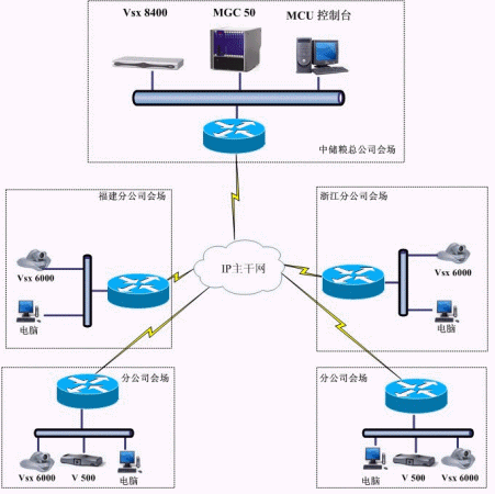 中心MCU采用美國POLYCOM公司 MGC-50多點(diǎn)控制單元,安裝在中儲糧北京總公司的中心機(jī)房。北京總公司主會場安放POLYCOM VSX 8400視頻會議系統(tǒng)一套,并在北京、內(nèi)蒙、浙江、吉林、貴州等24個分公司以及聯(lián)絡(luò)處的會場配置VSX 6000視頻會議系統(tǒng),其中13個分公司額外配置VSX 500視頻會議終端各一臺以放置于小會議室。其網(wǎng)絡(luò)結(jié)構(gòu)圖如下: