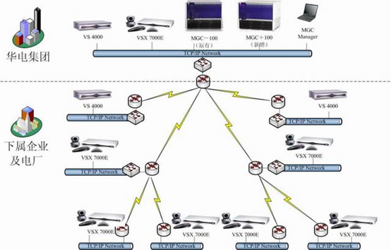華電集團領導十分重視電力信息化及華電集團電子政務的建設工作。為了貫徹國務院對政府系統(tǒng)信息化建設的要求,實現(xiàn)華電集團政務辦公和行業(yè)管理信息服務的電子化、網(wǎng)絡化,滿足華電集團建立辦事高效、運轉協(xié)調、行為規(guī)范的行政管理體制的要求,加快推進電力行業(yè)信息化建設,華電集團決定開展華電集團信息化建設二期工程建設,即在現(xiàn)有的基礎上再增加一臺MCU以及在下屬企業(yè)及電廠增加37臺終端。鑒于POLYCOM在視頻會議強大的技術優(yōu)勢以及神州數(shù)碼在視頻會議系統(tǒng)建設和實施上的雄厚實力和豐富經(jīng)驗,華電集團決定包括MCU和終端的所有設備都采用POLYCOM的產(chǎn)品。整個系統(tǒng)主要建立在華電集團現(xiàn)有的視頻會議的基礎之上,依據(jù)H.323標準協(xié)議建設視頻會議系統(tǒng)二期組網(wǎng)。其中,控制中心新增一臺POLYCOM公司的MGC+100多點控制單元(即MCU);POLYCOM 高性能的VSX7000E作為下屬企業(yè)及電廠主接點視頻會議終端。
