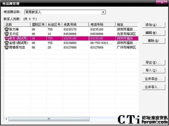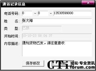 在A8電腦傳真機(jī)的電話商務(wù)通軟件主界面,雙擊通話記錄中的某個(gè)客戶號(hào)碼,或選中該號(hào)碼點(diǎn)擊下面的通話歷史按鈕,您與該客戶的通話歷史便一覽無(wú)余。選中某個(gè)記錄,您可以對(duì)其進(jìn)行編輯(添加姓名、備注該次通話的內(nèi)容),刪除,軟件撥出,加入電話簿等操作。