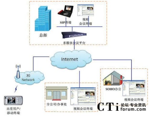 本系統(tǒng)通常將會(huì)議系統(tǒng)安裝于公司總部,應(yīng)用服務(wù)器與媒體服務(wù)器全部實(shí)現(xiàn)雙掛,同時(shí)接入公司內(nèi)網(wǎng)和公網(wǎng)。各分公司安裝的視頻數(shù)據(jù)會(huì)議終端、SIP話機(jī),通過(guò)Internet或?qū)>聯(lián)接到總部會(huì)議服務(wù)器的公網(wǎng)出口。公司內(nèi)部辦公室、會(huì)議室的視頻數(shù)據(jù)會(huì)議終端、SIP話機(jī),通過(guò)局域網(wǎng)連接到會(huì)議服務(wù)器。會(huì)議服務(wù)器通配合IPPBX、語(yǔ)音網(wǎng)關(guān),接入外線,實(shí)現(xiàn)普通電話和手機(jī)接入會(huì)議。全面支持IP電話和模擬電話。當(dāng)遠(yuǎn)程用戶沒(méi)有條件進(jìn)行視頻數(shù)據(jù)會(huì)議時(shí),可以單獨(dú)使用音頻,或者音頻+數(shù)據(jù)的方式進(jìn)行會(huì)議,以保證在網(wǎng)絡(luò)條件很差時(shí)也能夠進(jìn)行協(xié)同辦公。本系統(tǒng)采用不同級(jí)別的IPPBX或語(yǔ)音網(wǎng)關(guān)直連FXO口接入PSTN市話,保留了傳統(tǒng)的模擬電話線路。