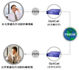 有了AltiGen提供的網(wǎng)路電話閘道器,跨國公司的臺北業(yè)務(wù)員只要花市內(nèi)電話的費用,就可以跟北京出差的總經(jīng)理共商要事,節(jié)省的70 %以上的國際電話費用。通訊流程如下:
