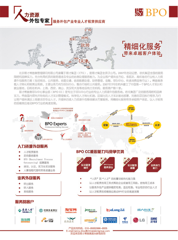 北京易才博普奧管理顧問有限公司(CTG BPO)是易才集團(tuán)全資子公司。2007年啟動運營,依托集團(tuán)全國的服務(wù)網(wǎng)絡(luò)和品牌實力,充分利用優(yōu)質(zhì)的服務(wù)理念及專業(yè)的信息處理服務(wù)能力,為企業(yè)客戶提供全方位、多層次、高標(biāo)準(zhǔn)的行業(yè)性人力資源外包服務(wù)方案(包括物流、公共服務(wù)、地面交通、信息數(shù)據(jù)處理、財務(wù)管理、金融、呼叫中心、快速消費品等行業(yè))。