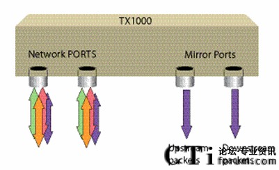 與TX100相同,將TX1000直接高阻搭接在網(wǎng)絡(luò)中的任何位置,兩個(gè)Network端口高阻搭接在主干網(wǎng)上,另兩個(gè)端口Monitor A和Monitor