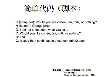 世界上最古老的用戶界面--人類語(yǔ)言終于在二十一世紀(jì)借助于VoiceXML,一種語(yǔ)音可擴(kuò)展標(biāo)記語(yǔ)言發(fā)展成熟起來(lái)。作為世界上第一個(gè)真正的語(yǔ)音通信標(biāo)準(zhǔn),它定義了應(yīng)用開發(fā)商向用戶提供新型信息訪問(wèn)服務(wù)的方式。通過(guò)這種服務(wù),用戶在任何地方,都可以通過(guò)電話或任何移動(dòng)設(shè)備,虛擬訪問(wèn)任何信息。VoiceXML正在被廣泛應(yīng)用于旅游、金融與信息服務(wù)等行業(yè)的各種業(yè)務(wù)領(lǐng)域中,甚至是政府部門與市政機(jī)構(gòu),全球的無(wú)線運(yùn)營(yíng)商等。
