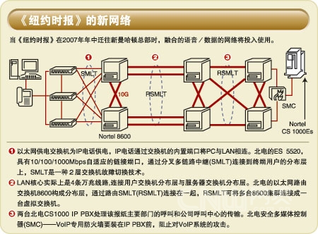 VoIP架構(gòu)是基于北電的通信服務(wù)器CS 1000平臺,該平臺是一種基于服務(wù)器的IP PBX。CS 1000是基于北電的Meridian PBX特性集合,其主機運行在一臺來自WindRiver系統(tǒng)公司的VxWorks實時操作系統(tǒng)的IP服務(wù)器上。一對冗余的CS1000將為新聞、廣告、發(fā)行和其他部門中大約3600 部IP電話以及部署在《紐約時報》的分類/顯示廣告呼叫中心的300部IP軟電話提供服務(wù)。CS 1000提供對34臺以上的媒體網(wǎng)關(guān)和18臺信令服務(wù)器(部署在網(wǎng)絡(luò)中為內(nèi)網(wǎng)連接的不同部門提供VoIP呼叫建立和信令的分布式專用設(shè)備)的集中管理。