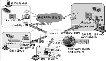 企業(yè)總部/數(shù)據(jù)中心基本采用DDN專線或租用以太網(wǎng)鏈路連接到本地服務(wù)提供商(ISP),此時(shí)Contivity (Contivity 4600/5000)獲得固定的合法IP地址,大型遠(yuǎn)程分支機(jī)構(gòu)同樣可以采用DDN專線的方式連接到本地服務(wù)提供商(ISP),此時(shí)分部的Contivity(Contivity