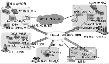 在企業(yè)網(wǎng)上加載北電網(wǎng)絡(luò)話音設(shè)備(BCM,CSE1K或ITG/M1),再配合上北電網(wǎng)絡(luò)的IP電話i2002/i2004,或在移動(dòng)用戶的PC上安裝i2050