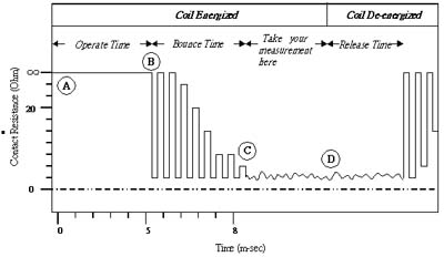 1) Operate Time:驅(qū)動(dòng)電路推動(dòng)繼電器直至開(kāi)關(guān)第一次閉合的時(shí)間,為A-B區(qū)段。