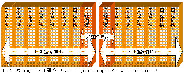 PICMG 2.0 CompactPCI系統(tǒng)是由一組或多組CompactPCI 總線所組成,每個總線最多可達(dá)8個CompactPCI板卡插槽,其中包含一個系統(tǒng)插槽(system slot)與最多達(dá)7個外圍插槽(peripheral slot)。PCI總線是作為該總線內(nèi)插槽之間的主要通訊途徑,在這個架構(gòu)下,PCI總線與系統(tǒng)插槽是一個可能的故障單點(diǎn),故障的周邊插槽會讓整個PCI總線停止作用而阻礙了其它任一插槽之間的通訊。這種故障單點(diǎn)成為CompactPCI采用高可靠度應(yīng)用的一個主要障礙,早期的CompactPCI 高可靠度系統(tǒng)架構(gòu)必須克服PCI總線單點(diǎn)故障的限制,典型的解決方法則是添加第二個CompactPCI 總線且讓此二個總線的功能相同。圖2顯示雙CompactPCI 總線架構(gòu)的范例。