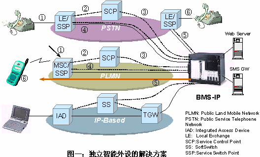 隨著智能業(yè)務(wù)的發(fā)展,智能網(wǎng)中獨(dú)立智能外設(shè)(IIP)的應(yīng)用越來(lái)越廣,其功能也得到了很大的增強(qiáng),如:增加了部分業(yè)務(wù)邏輯功能以擴(kuò)展SCP的業(yè)務(wù)邏輯、主動(dòng)呼出功能、業(yè)務(wù)和用戶數(shù)據(jù)存儲(chǔ)管理功能,開(kāi)放接口等。這種增強(qiáng)型IIP能滿足復(fù)雜的增值業(yè)務(wù)需要,提供有效的業(yè)務(wù)控制和網(wǎng)絡(luò)資源利用,代表當(dāng)前應(yīng)用的主流,已在一些業(yè)務(wù)中有了出色的表現(xiàn)。圖一是采用增強(qiáng)型IIP作為BMS平臺(tái)的原理圖。