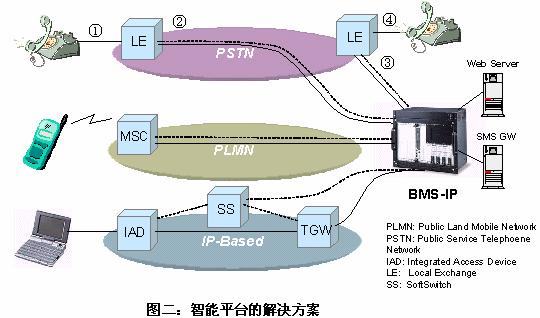 隨著通信發(fā)展,用戶對(duì)業(yè)務(wù)的多樣性、個(gè)性化和智能化的需求愈發(fā)緊迫。因此一種新業(yè)務(wù)在投入市場(chǎng)的時(shí)間,業(yè)務(wù)量和對(duì)現(xiàn)網(wǎng)設(shè)備改造等方面都提出了新的挑戰(zhàn)。智能業(yè)務(wù)平臺(tái)以分布接入、集中控制、業(yè)務(wù)擴(kuò)展靈活,可快速實(shí)現(xiàn)各類電信增值新業(yè)務(wù)的突出優(yōu)點(diǎn),滿足了人們對(duì)電信新業(yè)務(wù)的迫切需要。智能業(yè)務(wù)平臺(tái)投資小、見(jiàn)效快,是近年來(lái)實(shí)現(xiàn)增值業(yè)務(wù)的優(yōu)選方案。在固定和移動(dòng)、電信和IT融合的發(fā)展潮流中,它具有很大的想象空間。用智能業(yè)務(wù)平臺(tái)實(shí)現(xiàn)BMS的工作原理如圖二所示。