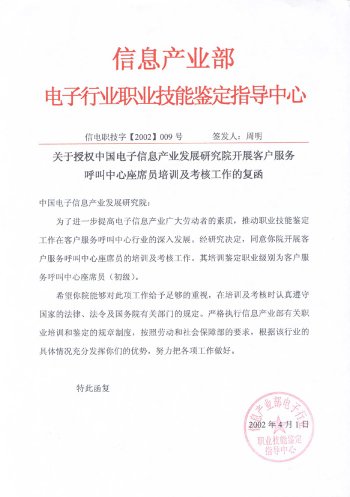 中國電子信息產(chǎn)業(yè)發(fā)展研究院職業(yè)技能培訓(xùn)部是中國電子信息產(chǎn)業(yè)發(fā)展研究院旗下專業(yè)從事IT職業(yè)技能培訓(xùn)的機(jī)構(gòu)。呼叫中心職業(yè)技能培訓(xùn)工作是培訓(xùn)中心常年開展的主要培訓(xùn)項(xiàng)目。培訓(xùn)中心受信息產(chǎn)業(yè)部委托,負(fù)責(zé)全國范圍內(nèi)"呼叫中心客戶服務(wù)座席員"的授權(quán)培訓(xùn)及考核工作。既是呼叫中心行業(yè)基礎(chǔ)操作人員培訓(xùn)及考核的權(quán)威機(jī)構(gòu),又是配合行業(yè)管理、全面支撐和提升整個(gè)呼叫中心產(chǎn)業(yè)的服務(wù)機(jī)構(gòu)。