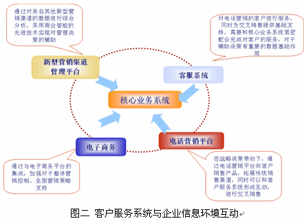 客戶(hù)服務(wù)系統(tǒng)不是孤立的系統(tǒng),是能夠與客戶(hù)現(xiàn)有信息環(huán)境,包括:核心業(yè)務(wù)系統(tǒng)、多渠道營(yíng)銷(xiāo)、電子商務(wù)等進(jìn)行互動(dòng)的智能信息系統(tǒng),從而使呼叫中心成為企業(yè)的戰(zhàn)略資產(chǎn),幫助企業(yè)提升客戶(hù)滿(mǎn)意度、深度挖掘客戶(hù)價(jià)值?蛻(hù)服務(wù)系統(tǒng)與企業(yè)其它信息系統(tǒng)的互動(dòng)可以通過(guò)圖二反映。