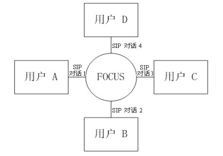緊耦合會(huì)議的邏輯架構(gòu)圖如圖三所示。會(huì)議中的核心是"會(huì)議中心(conference focus)",每一個(gè)會(huì)議都有一個(gè)會(huì)議中心,由一個(gè)URI標(biāo)識(shí),用戶(hù)通過(guò)聯(lián)系這個(gè)URI參加到一個(gè)會(huì)議中去。會(huì)議中心和用戶(hù)之間的拓?fù)浣Y(jié)構(gòu)為星性結(jié)構(gòu)。會(huì)議中心為用戶(hù)提供并維持一個(gè)信令連接,并且可以執(zhí)行會(huì)議策略,實(shí)現(xiàn)對(duì)會(huì)議的控制和管理。