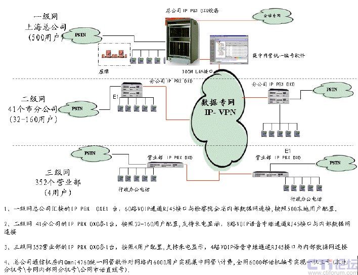 根據(jù)合同,阿爾卡特朗訊將提供1 套Omni PCX Enterprise(面向大中型機(jī)構(gòu)的通信平臺(tái))500 用戶作為核心交換節(jié)點(diǎn),394 套Omni PCX Office(面向中小型機(jī)構(gòu)的通信平臺(tái))系統(tǒng)分別為4-160 用戶作為分支交換節(jié)點(diǎn)。全網(wǎng)總計(jì)多達(dá)6000 多個(gè)用戶,覆蓋1 個(gè)總公司、41 個(gè)分公司和352 個(gè)營(yíng)業(yè)部。在設(shè)計(jì)組網(wǎng)方案時(shí),阿爾卡特朗訊根據(jù)用戶的需求和實(shí)際情況,并充分考慮現(xiàn)有的數(shù)據(jù)網(wǎng)絡(luò)資源,提出采用星狀網(wǎng)絡(luò)組網(wǎng)結(jié)構(gòu)建設(shè)PBX VOIP 語音網(wǎng)絡(luò),不僅可以充分保障通信的安全性和可靠性,同時(shí)還可最大限度保護(hù)現(xiàn)有投資,節(jié)省費(fèi)用。
