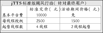 jTTS標準版在聲音質量、聲音平滑度、自然度等方面已具有比較高的實用化水平。為了真正啟動語音技術的應用市場,捷通華聲啟動“颶風行動”,在活動期間為最終客戶、系統集成商制定了一個極具競爭力的價格,并且無平臺費。這次活動主要針對CTI領域中大量中小型系統的應用開展此次活動,目的是讓先進的技術能夠被更多的用戶采用,為系統集成商應用TTS技術提供了很高的利潤空間。