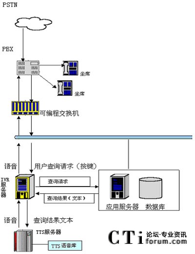 用戶撥打統(tǒng)一特服號碼進(jìn)入客戶服務(wù)系統(tǒng),經(jīng)過自動語音系統(tǒng)提示,選擇公共信息查詢項(xiàng)目。用戶可以通過電話提交他的查詢請求(比如使用按鍵方式),IVR服務(wù)器收到請求后會向其他應(yīng)用服務(wù)器提交此查詢請求,當(dāng)IVR得到查詢結(jié)果后,他會將文本形式的查詢結(jié)果交給jTTS服務(wù)器,jTTS服務(wù)器會返回查詢結(jié)果的語音形式,最終語音會在坐席上播放,用戶就可以聽到他剛才所要查詢的信息。