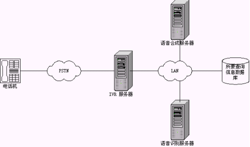 這種模式是最常見的一種接入情況。將原有煩瑣的按鍵式提示改成更具人性化的交談式語(yǔ)音交互,類似于語(yǔ)音門戶模式。這是目前大家普遍認(rèn)同的一種語(yǔ)音識(shí)別技術(shù)應(yīng)用方式。相比原有的按鍵方式,系統(tǒng)的新穎程度、個(gè)性化程度、用戶操作的方便程度等都得到了極大的提高,如語(yǔ)音識(shí)別技術(shù)在股票查詢中的成功應(yīng)用,在點(diǎn)歌系統(tǒng)中的成功應(yīng)用等;另外利用語(yǔ)音識(shí)別技術(shù)也解決了一些原有系統(tǒng)無(wú)法實(shí)現(xiàn)的技術(shù)難題,如火車時(shí)刻查詢、機(jī)場(chǎng)航班查詢等,原有系統(tǒng)借助郵政編碼、電話區(qū)號(hào)等的方式讓人無(wú)所適從,現(xiàn)在直接和系統(tǒng)交談,順利獲取所需信息,可以說(shuō)是語(yǔ)音識(shí)別技術(shù)一個(gè)成功的應(yīng)用。這種系統(tǒng)的拓?fù)浣Y(jié)構(gòu)如下圖示: