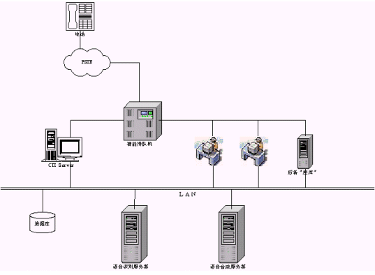 IVR模式是最常見的一種模式,這種模式也可以結(jié)合應(yīng)用到前端以交換機(jī)接入的系統(tǒng)中去,在系統(tǒng)的IVR服務(wù)流程上,做出相應(yīng)的修改,加入語(yǔ)音識(shí)別技術(shù),同樣可以得到成功應(yīng)用。另外一種模式暫且稱它為后備模式,該模式一個(gè)主要的特點(diǎn)是放在后端,比如在有座席接聽的情況下,采用語(yǔ)音識(shí)別技術(shù)的系統(tǒng)不被激活,也就是系統(tǒng)不給派線。當(dāng)系統(tǒng)繁忙,而座席都占用的情況下,系統(tǒng)派線到采用語(yǔ)音識(shí)別技術(shù)的系統(tǒng),如同一個(gè)備用的座席。在這樣一個(gè)"座席"的軟件設(shè)計(jì)上,如同與人的交談一樣,系統(tǒng)也提出正常的詢問,但必須強(qiáng)調(diào)引導(dǎo)用戶來(lái)按照事先設(shè)定好的流程進(jìn)行。這樣可以保證系統(tǒng)的接通率,特別是在一些對(duì)接通率和服務(wù)及時(shí)性要求比較高的場(chǎng)合采用,典型的代表如電信114查號(hào)臺(tái)和移動(dòng)的1860客服中心,這些系統(tǒng)往往是隨著用戶急劇增加,撥打量也在穩(wěn)步上升,而呼叫響應(yīng)要求及時(shí)。系統(tǒng)拓?fù)浣Y(jié)構(gòu)如下圖示。