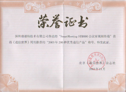 瑞福特視頻會議產(chǎn)品榮獲"2003年200種優(yōu)秀通信產(chǎn)品"稱號