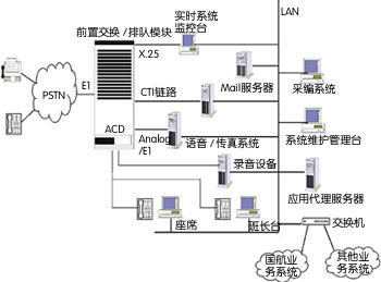 系統(tǒng)方案采用北電的Meridian11交換機(jī)作為前置交換/排隊(duì)設(shè)備, ACD功能內(nèi)置在交換機(jī)中。