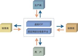讓我們看看這樣一個應(yīng)用,以固定網(wǎng)綜合信息平臺為基本支撐平臺,以“虛擬ICP”為業(yè)務(wù)承載平臺,包含了銷售商、生產(chǎn)商、供應(yīng)商、消費(fèi)用戶,形成了一個初步完整供應(yīng)鏈系統(tǒng),如圖所示。