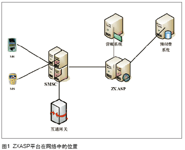 ZXASP:中興短消息增值業(yè)務平臺,是一個位于SMSC后端的增值業(yè)務邏輯控制處理網(wǎng)元,它為用戶提供新型短信增值業(yè)務開戶、銷戶以及業(yè)務使用流程控制支持等相關功能。核心網(wǎng)元ZXASP分別與短信中心、營帳系統(tǒng)以及預付費系統(tǒng)進行連接,以實現(xiàn)對用戶簽約多種增值業(yè)務情況下的服務支持。如圖1。