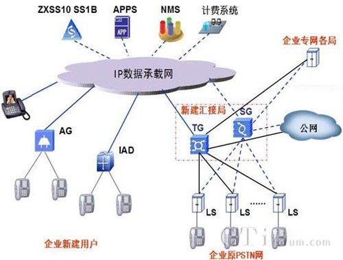 在各城市企業(yè)分支機構(gòu)數(shù)據(jù)局域網(wǎng)覆蓋到的任意辦公場所,根據(jù)需要在數(shù)據(jù)網(wǎng)上安裝各種軟交換網(wǎng)新型終端設(shè)備如AG、IAD、IP智能電話、IP視頻電話或者直接在PC電腦上安裝Softphone或企業(yè)數(shù)字通信助理軟件,通過標準的以太網(wǎng)接口連接到網(wǎng)絡(luò)中,在軟交換控制設(shè)備的控制下,直接通過企業(yè)數(shù)據(jù)網(wǎng)的傳送實現(xiàn)企業(yè)內(nèi)部語音、視頻和數(shù)據(jù)等多媒體綜合通信業(yè)務(wù)。