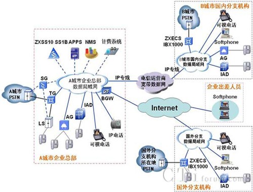 隨著大企業(yè)業(yè)務(wù)的不斷擴大,在其他地區(qū)會建立一些分支機構(gòu)。針對這些需求,中興通訊推薦IP-PBX的多媒體組網(wǎng)方案,方案如下: