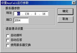 AnyCall還為用戶提供了一些個(gè)性化的設(shè)置,點(diǎn)擊AnyCall的設(shè)置按鈕。就會(huì)彈出一個(gè)對話框在里面有服務(wù)器參數(shù)和語音通訊設(shè)置兩個(gè)設(shè)置項(xiàng),如圖4所示。服務(wù)器參數(shù)主要是設(shè)置AnyCall的語音交換服務(wù)器的IP地址和端口,以便進(jìn)行更好的語音傳輸。在語音通訊里面可以設(shè)置自動(dòng)應(yīng)答,自動(dòng)接聽。這樣免去了每次來電都要去點(diǎn)接聽按鈕的麻煩。